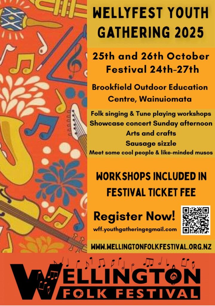 Hey everyone – get ready for an awesome time at the Wellington Folk Festival with our Youth Gathering! 🎉 We’ve got a bunch of fun workshops and music sessions lined up, led by some seriously cool tutors and musicians. It’s perfect for kids and teens who want to dive into music and have a blast.